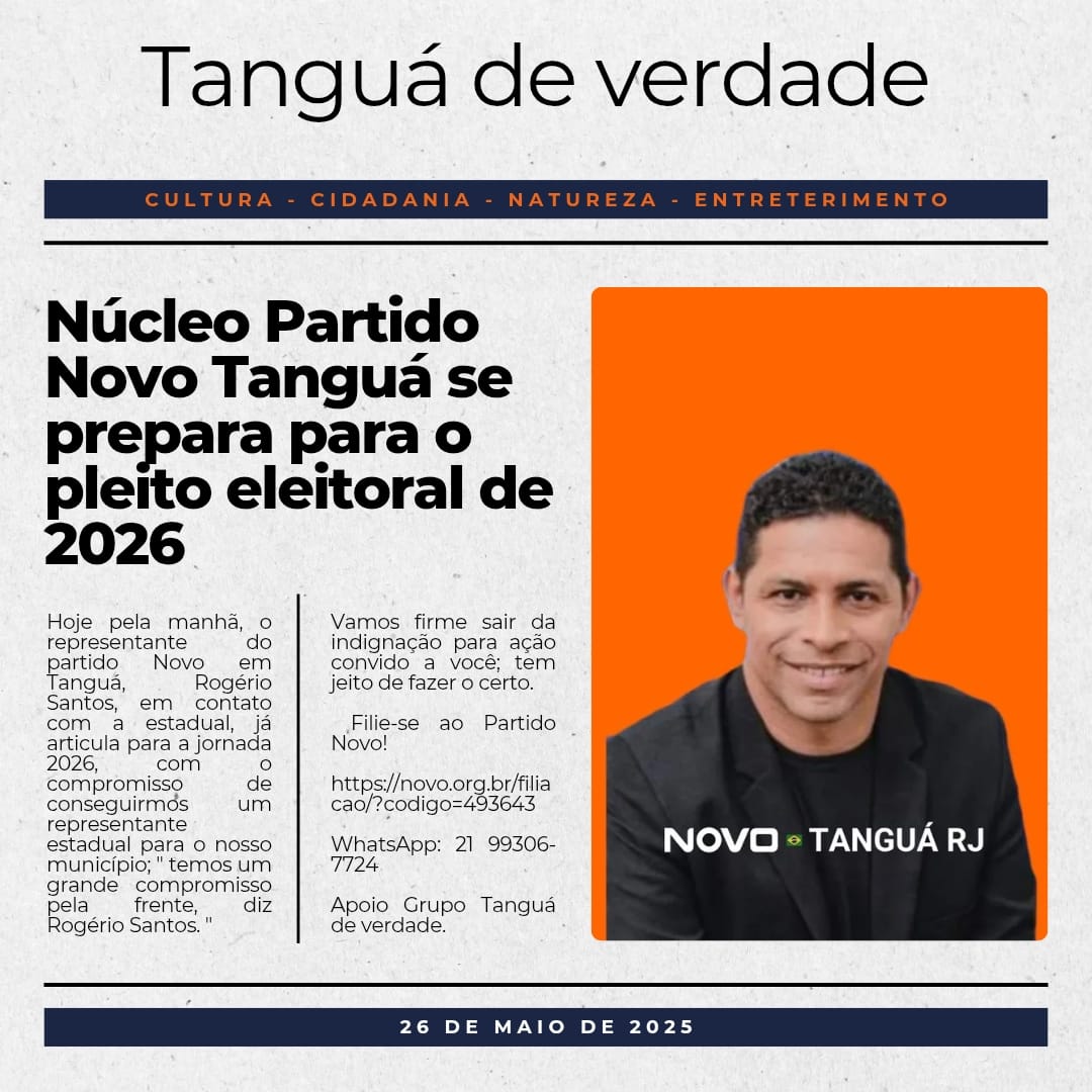 "Acredito em uma política feita com transparência, eficiência e participação cidadã. Apoio com convicção o trabalho de Rogério Santos e o fortalecimento do Partido Novo em Tanguá."